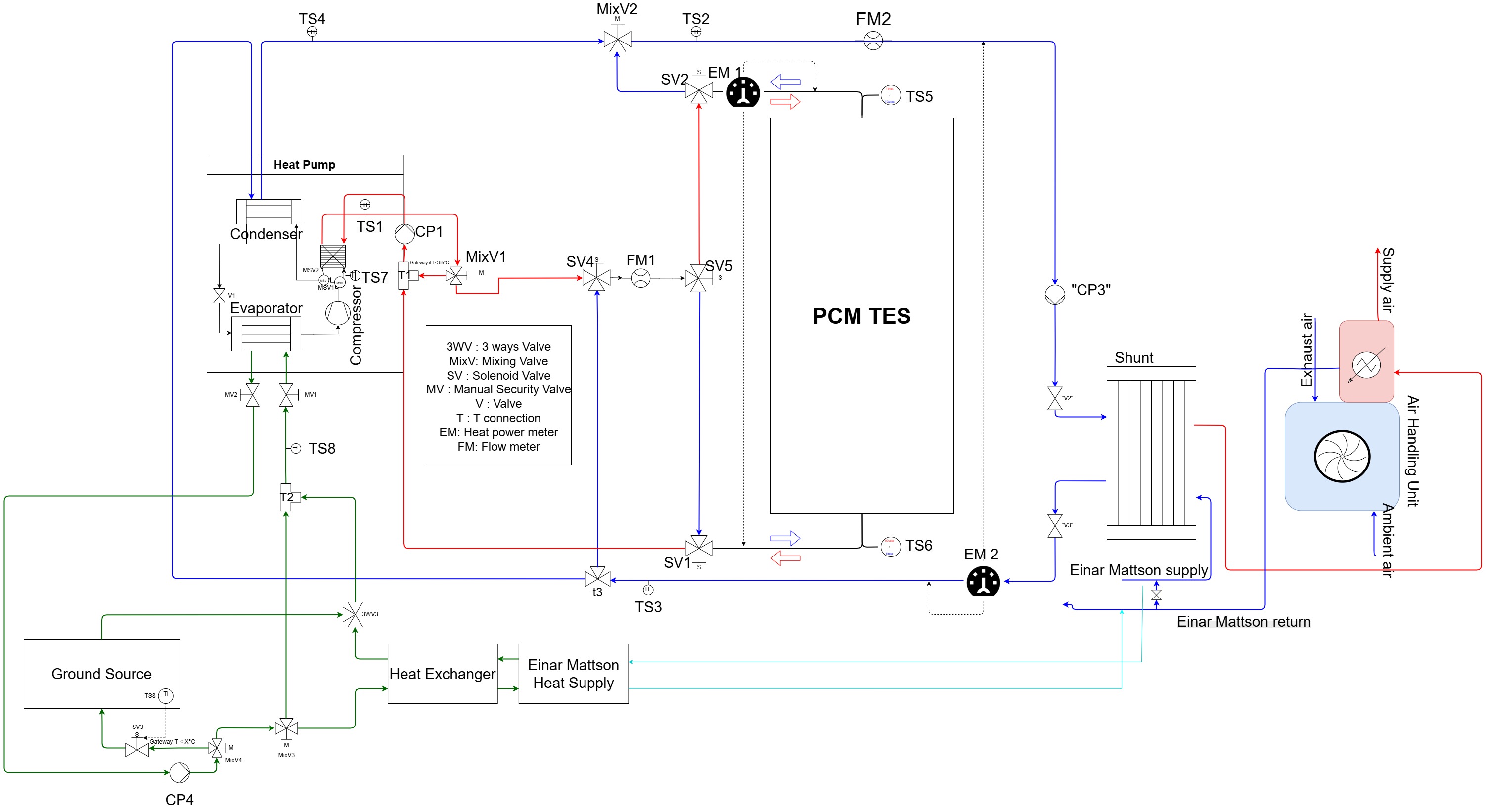 The project begins with developing detailed thermodynamic models of each system component. For the PCM-TES, this includes implementing enthalpy-based methods for phase-change modelling and heat transfer within the encapsulated capsules. The heat pump model will incorporate performance maps. Building and HVAC components will be modelled, including the air handling unit, hydraulic networks with pumps and valves, and the shunt heat exchanger system, also illustrated in Figure 1.